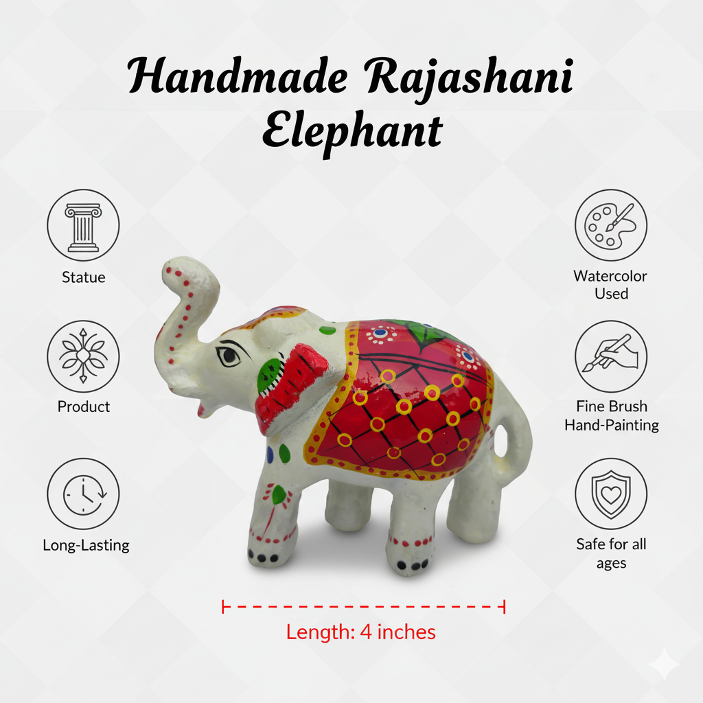 Experience the magic of Indian craftsmanship with our Handmade Watercolor Elephant Statue (4 inch) — a small yet stunning masterpiece that adds sophistication, meaning, and positivity to your surroundings.