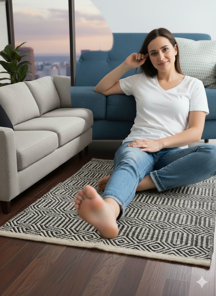Handmade Wool–Jute Area Rug (3×5 ft) – Soft, Durable, Washable | Cozy Winter-Ready Carpet | Boho Tribal Pattern for Living Room, Bedroom & Yoga